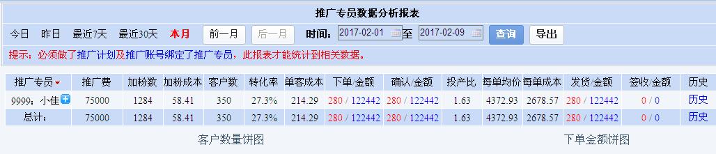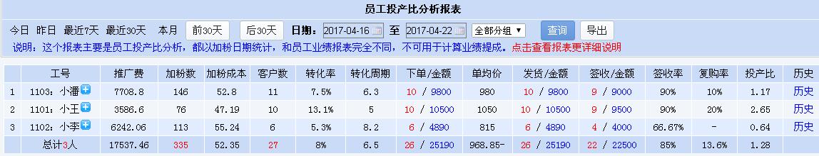 1.员工投产比报表 推广投入不再是只能针对推广渠道或推广帐号,可以有效并合理分布到每个销售人员身上,可以计算每个销售投入产出比等核心指标。举例:假设3月01号在百度推广4个微信号,共加粉60个,花费3000元,这样平均加粉成本50元/个,其中A员工的微信加粉10个,那在A员工身上的推广费就是500元。 ![]() 点击历史,还可以看历史趋势图 2.推广专员员分析报表 ![]() | ||
